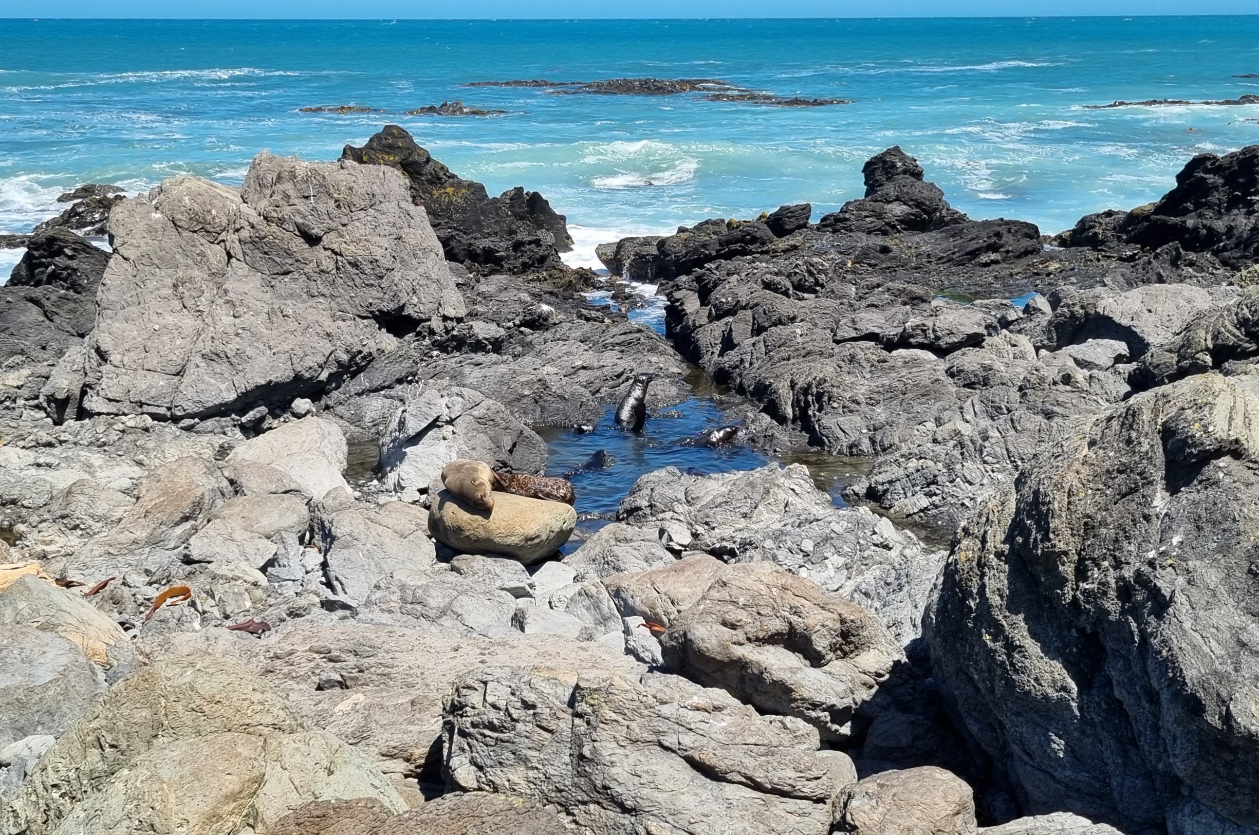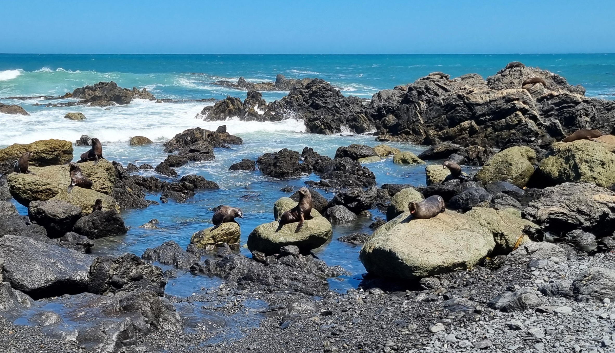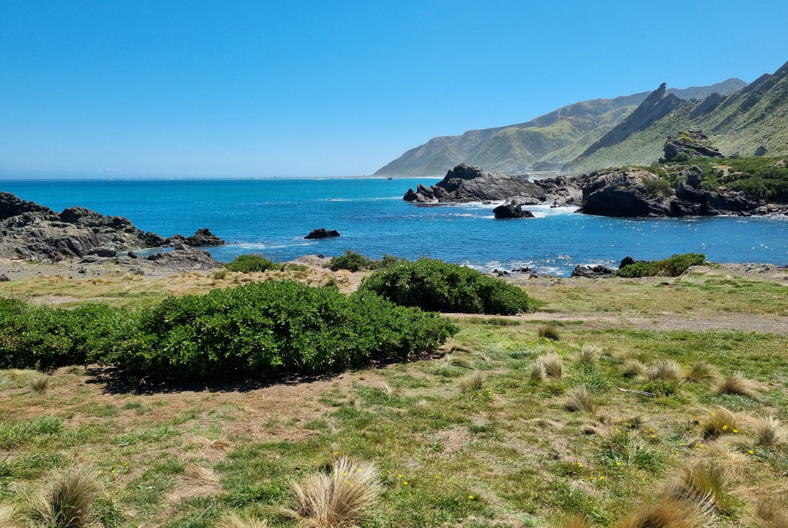 Gestern Samstag war ein perfekter Tag. Die Sonne schien von einem wolkenlosen Himmel. Mit 25 Grad war es angenehm warm und der kalte Südwind, der uns gestern zu schaffen machte, wehte nur noch schwach. Zudem war die Szenerie um das Cape Palliser, dem südlichsten Punkt der Nordinsel Neuseelands und auch dem südlichsten Punkt unserer Reise, perfekt. Und schliesslich konnten wir mehrere Robbenkolonien aus nächster Nähe beobachten. Dieser Abstecher auf dem Weg nach Wellington hat sich damit mehr als gelohnt.