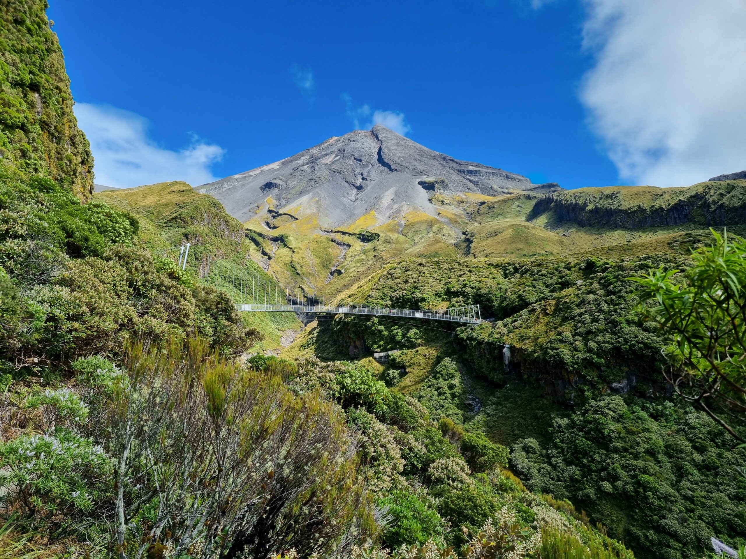 Viele, welche den 2518 Meter hohen Taranaki besteigen möchten, tun dies vom Parkplatz „Stratford Plateau“ auf 1172 Meter aus. Auch wir wählten diesen Parkplatz als Ausgangspunkt. Von dort führt der Weg zunächst zur Manganui Lodge. Immer hat man beim Aufstieg den Taranaki fotogen vor Augen.