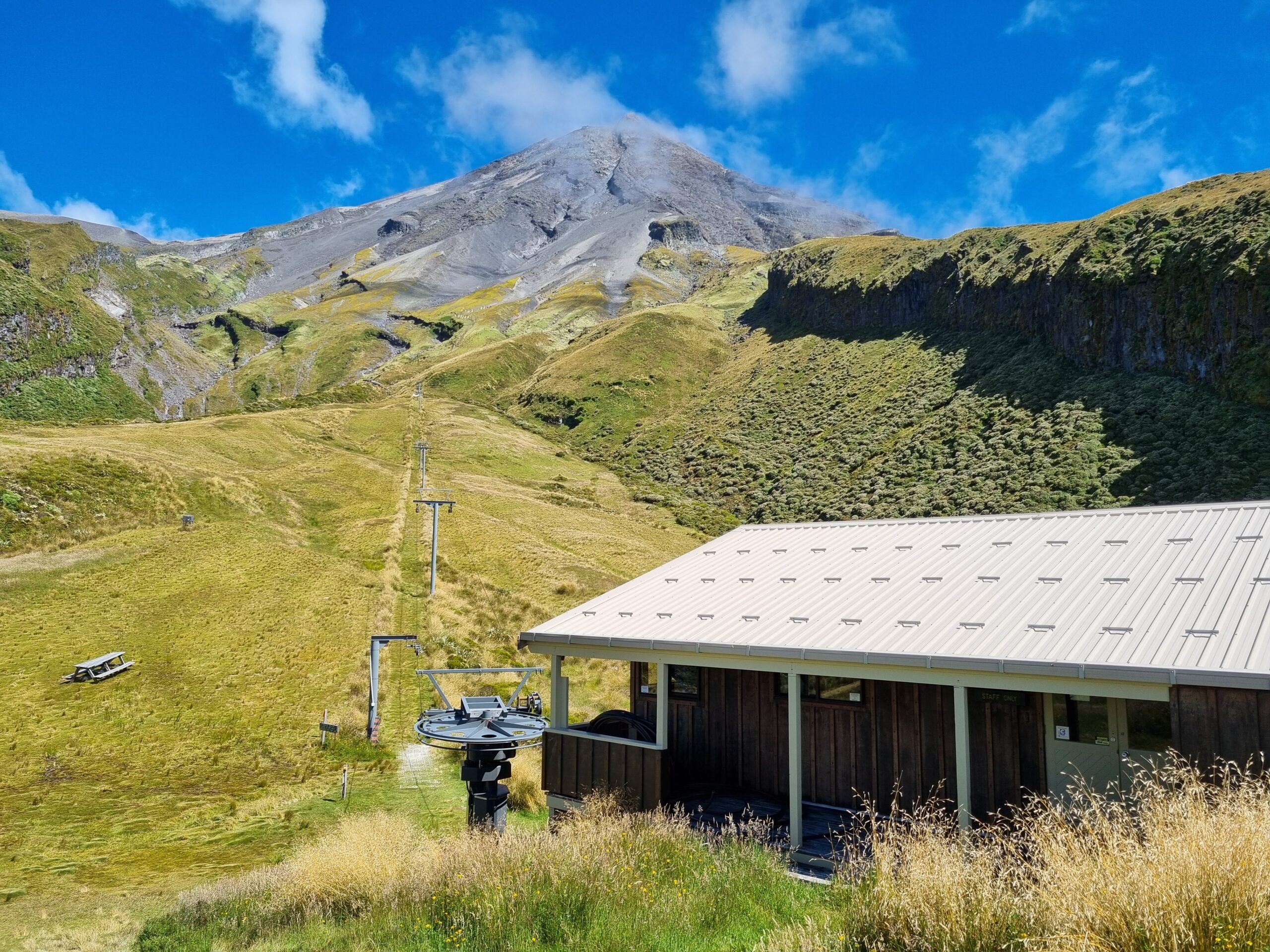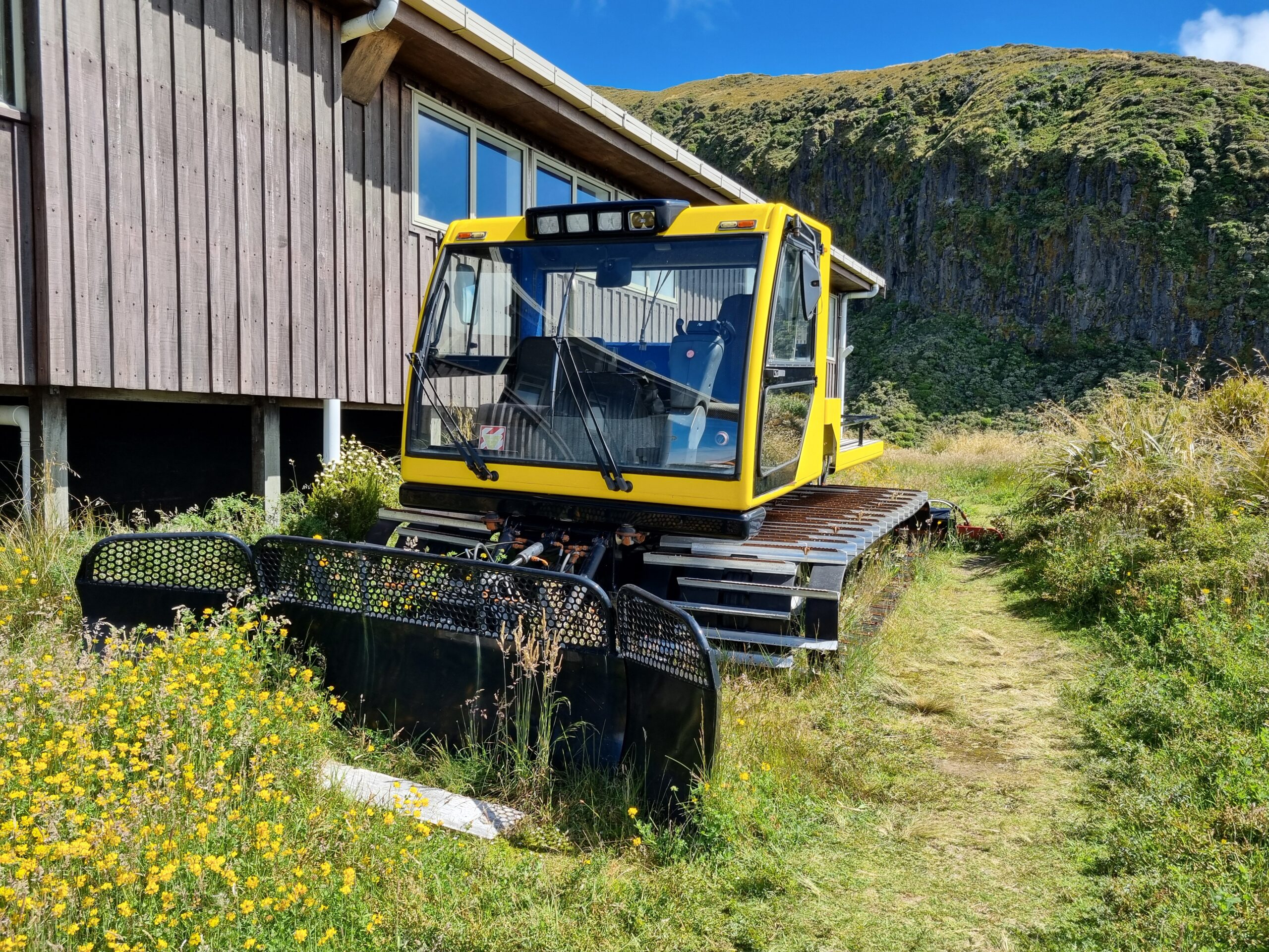 Schweizer Auswanderer haben sich hier, bei der Manganui Lodge, direkt am Fuss des Taranaki, ein Stück alte Heimat in die neue transferiert – einen Skilift samt zugehörigem, modernem Pistenfahrzeug.