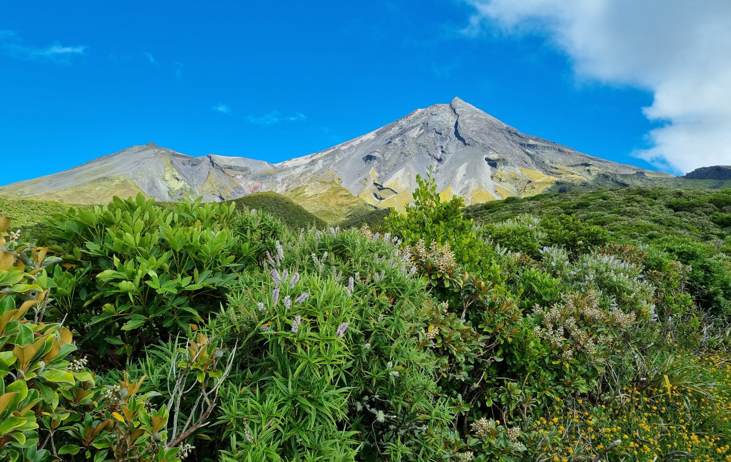 Der Taranaki (links) und sein kleinerer Bruder, der Paniahi, präsentieren sich für einen kürzeren Moment ohne Wolken. Vielfach bleiben diese jedoch am Taranaki hängen, welcher auf drei Seiten praktisch am Meer liegt, sodass immer für Nachschub von Feuchtigkeit gesorgt ist. Doch heute hatten wir Glück.