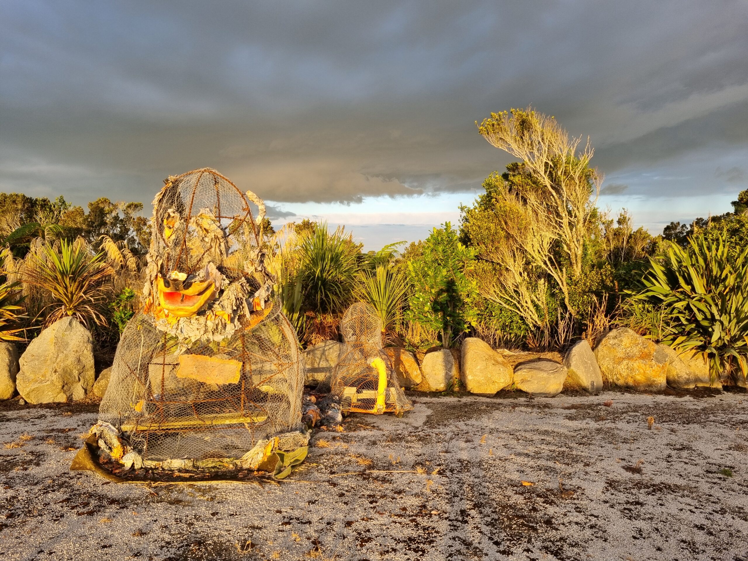 Weiter vorne im Tal regnete es noch. Die untergehende Sonne zauberte magische Farben auf eine Skulptur auf dem Gelände unserer Lodge.