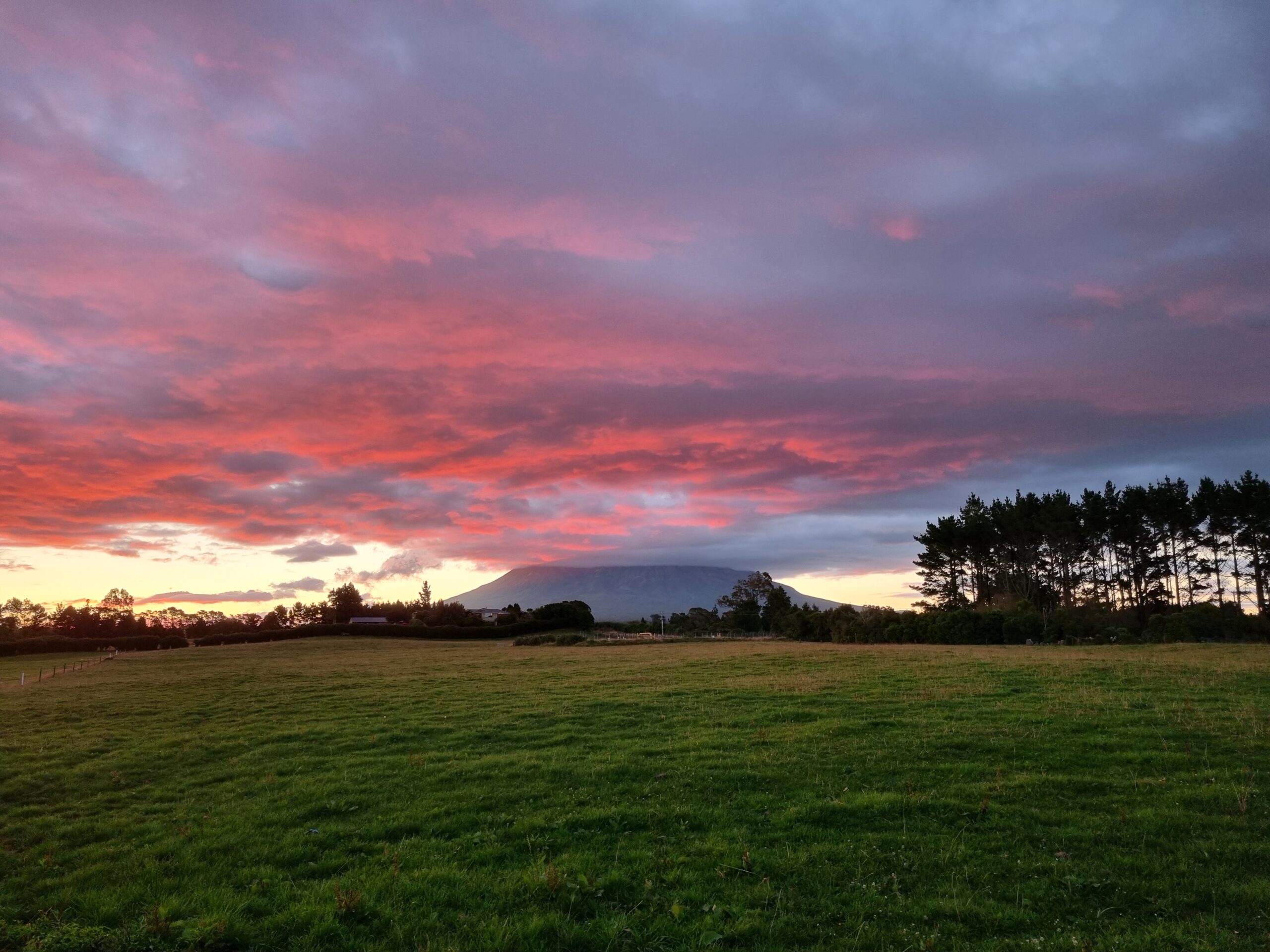 Dank der Wolken verabschiedete sich der Taranaki für heute mit einem wunderbaren Sonnenuntergang, fast so, als würde er Lava speihen. Solches war gemäss dem Besitzer unserer Lodge auch vorhergesagt. Dies ist nun vier Jahre her – bislang ist nichts geschehen. Doch das kann sich jederzeit ändern.