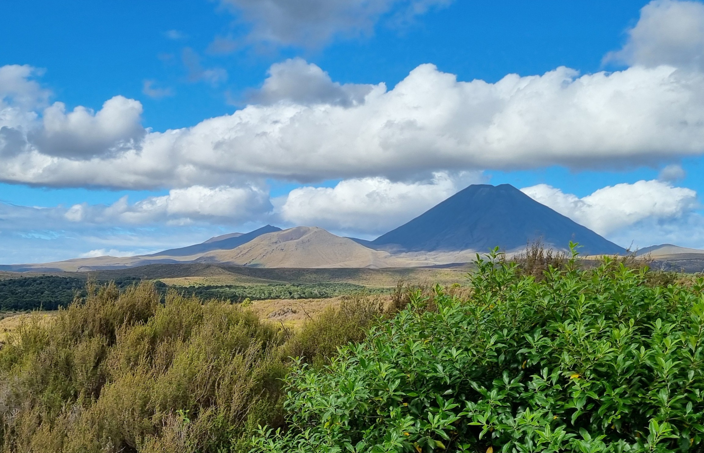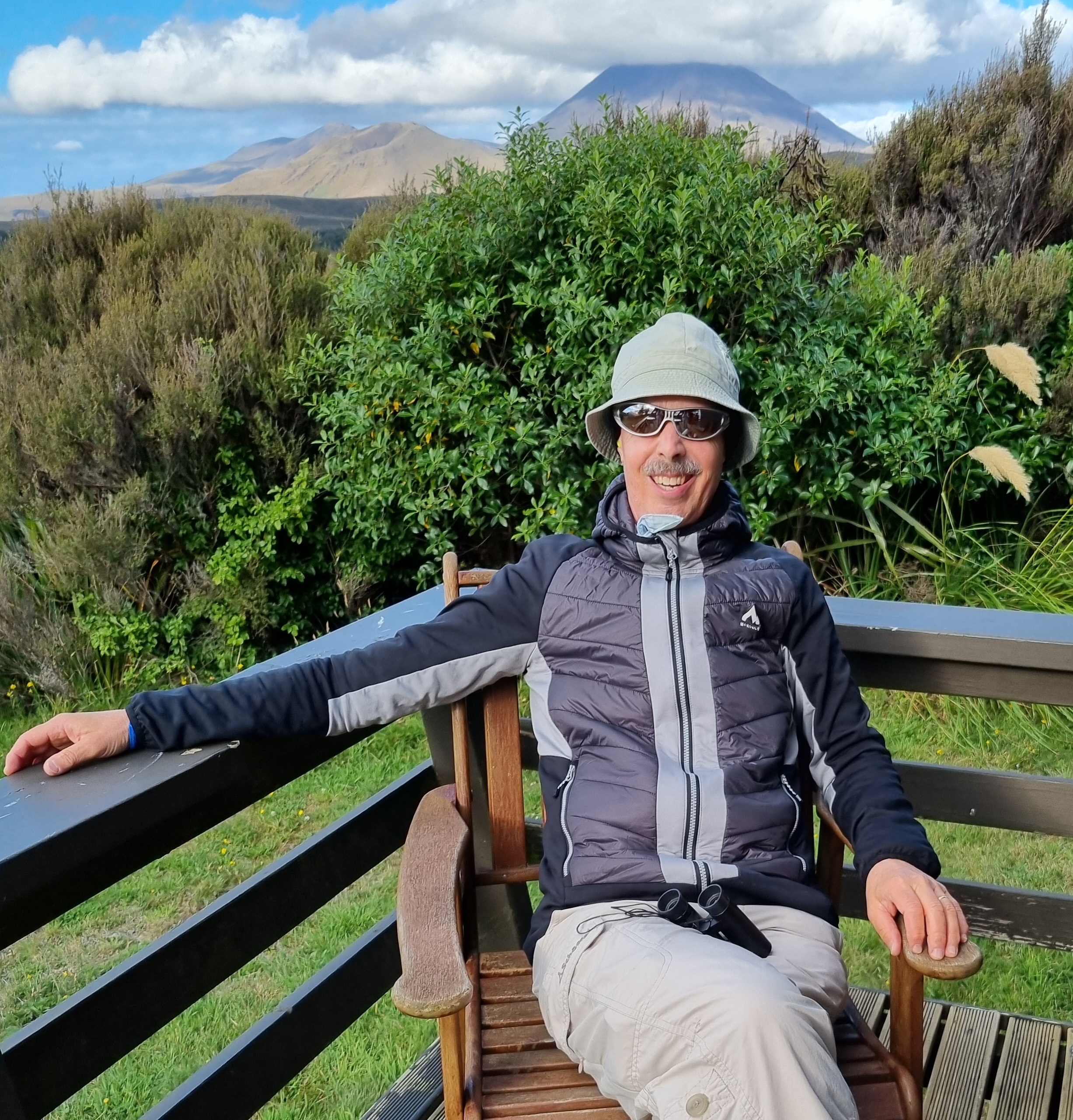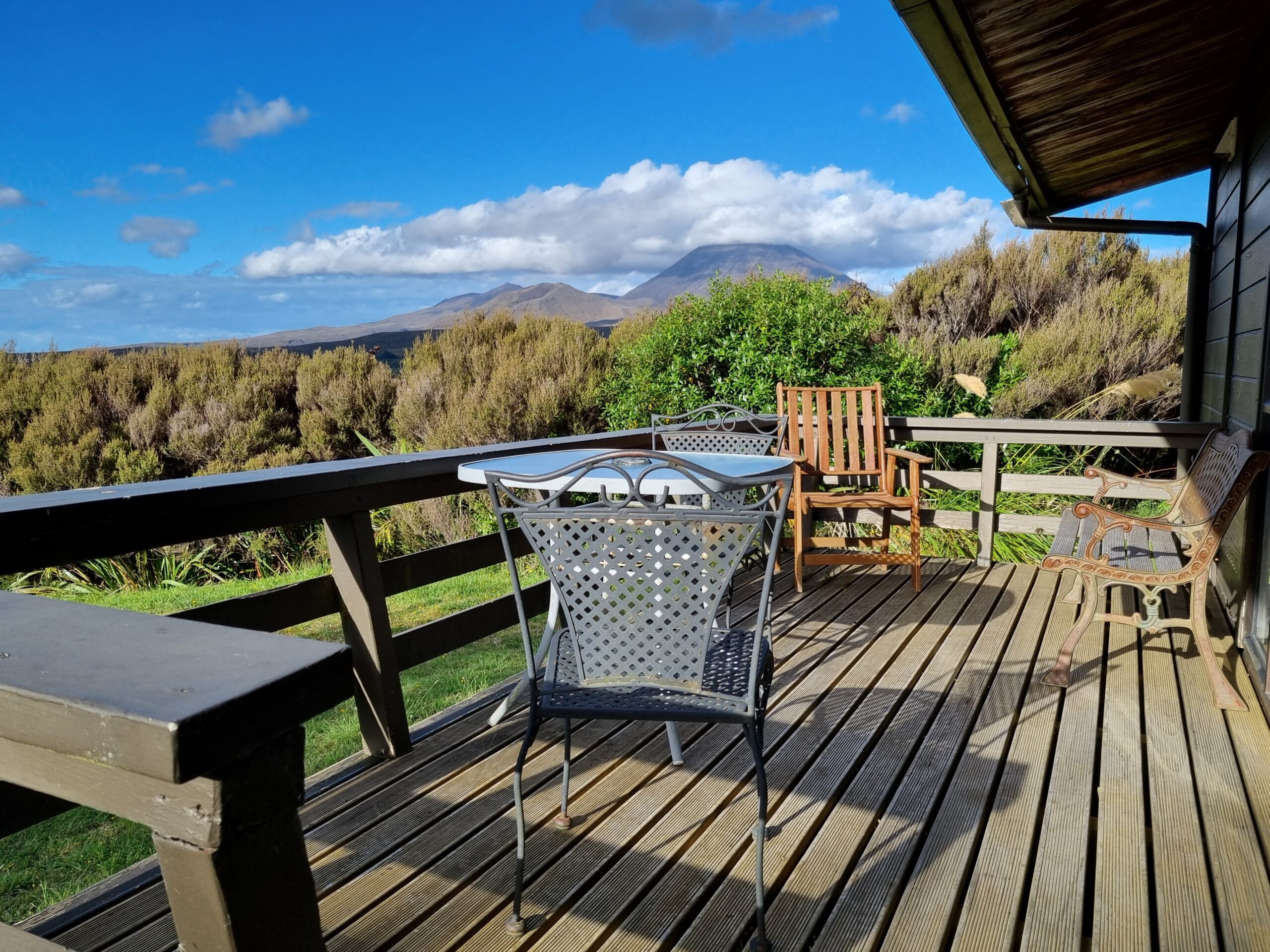 Unser Tagesziel war der Tongariro Nationalpark. Von der Terrasse unseres Häuschens aus kann man sie gut erkennen …