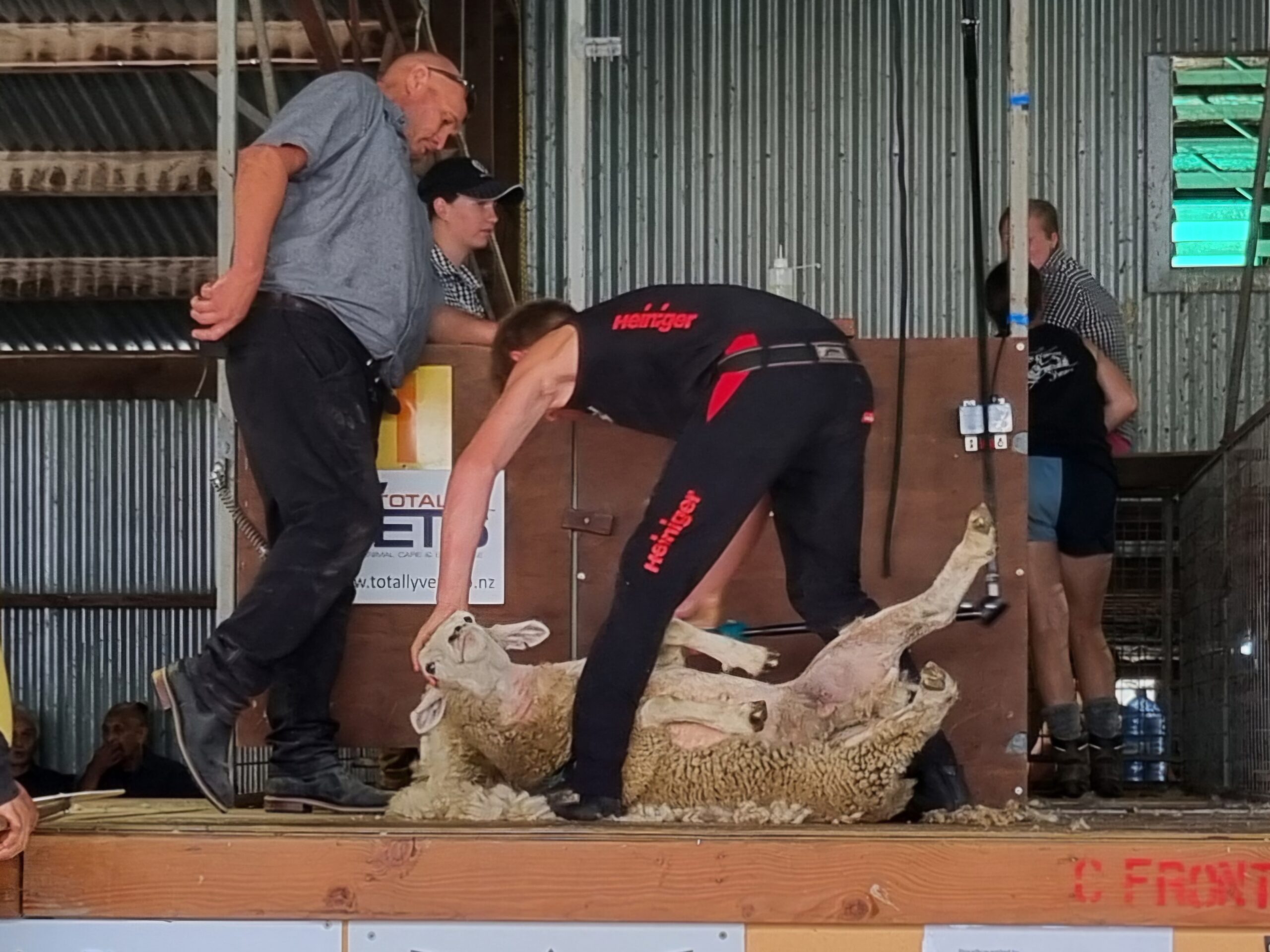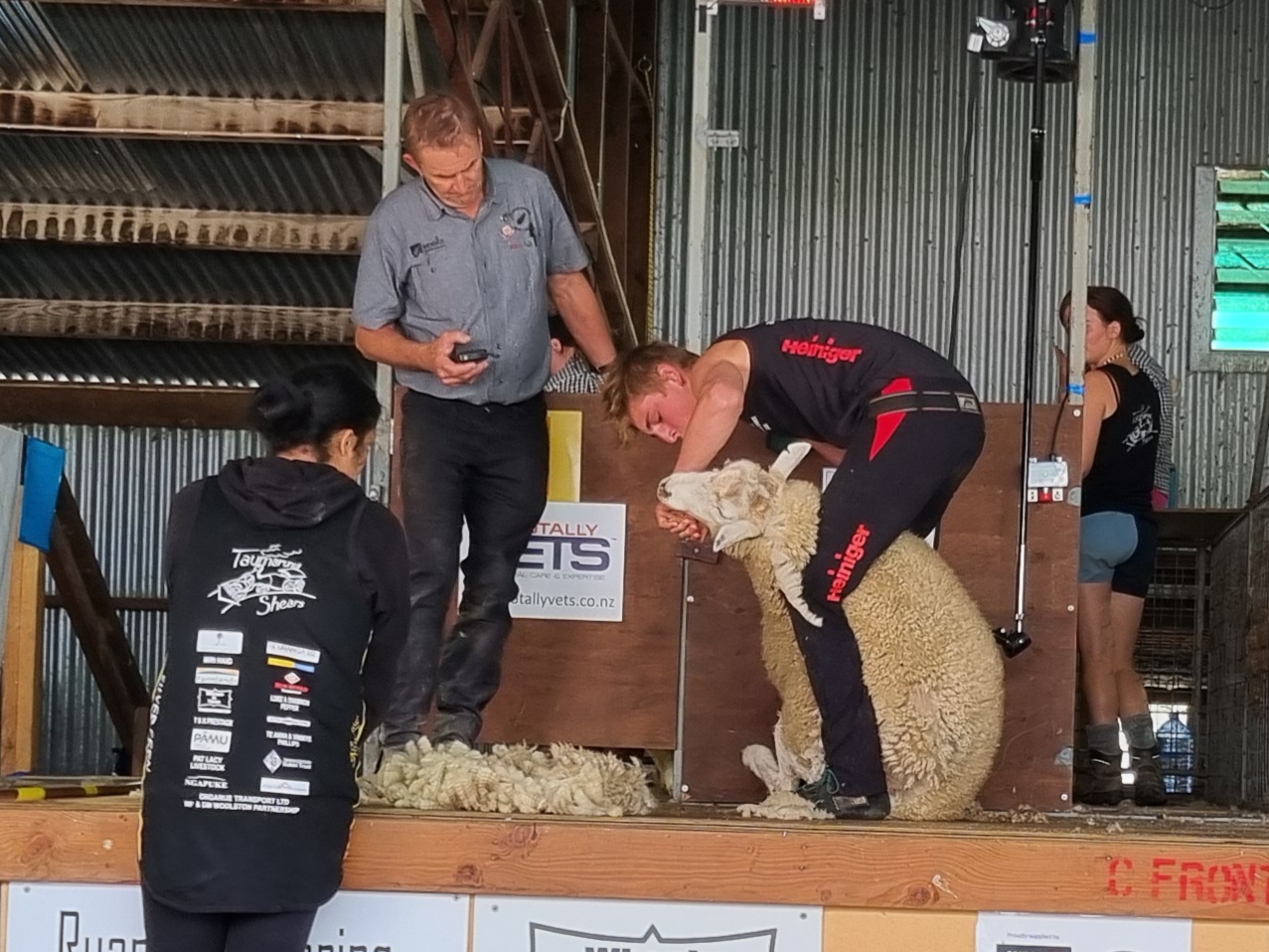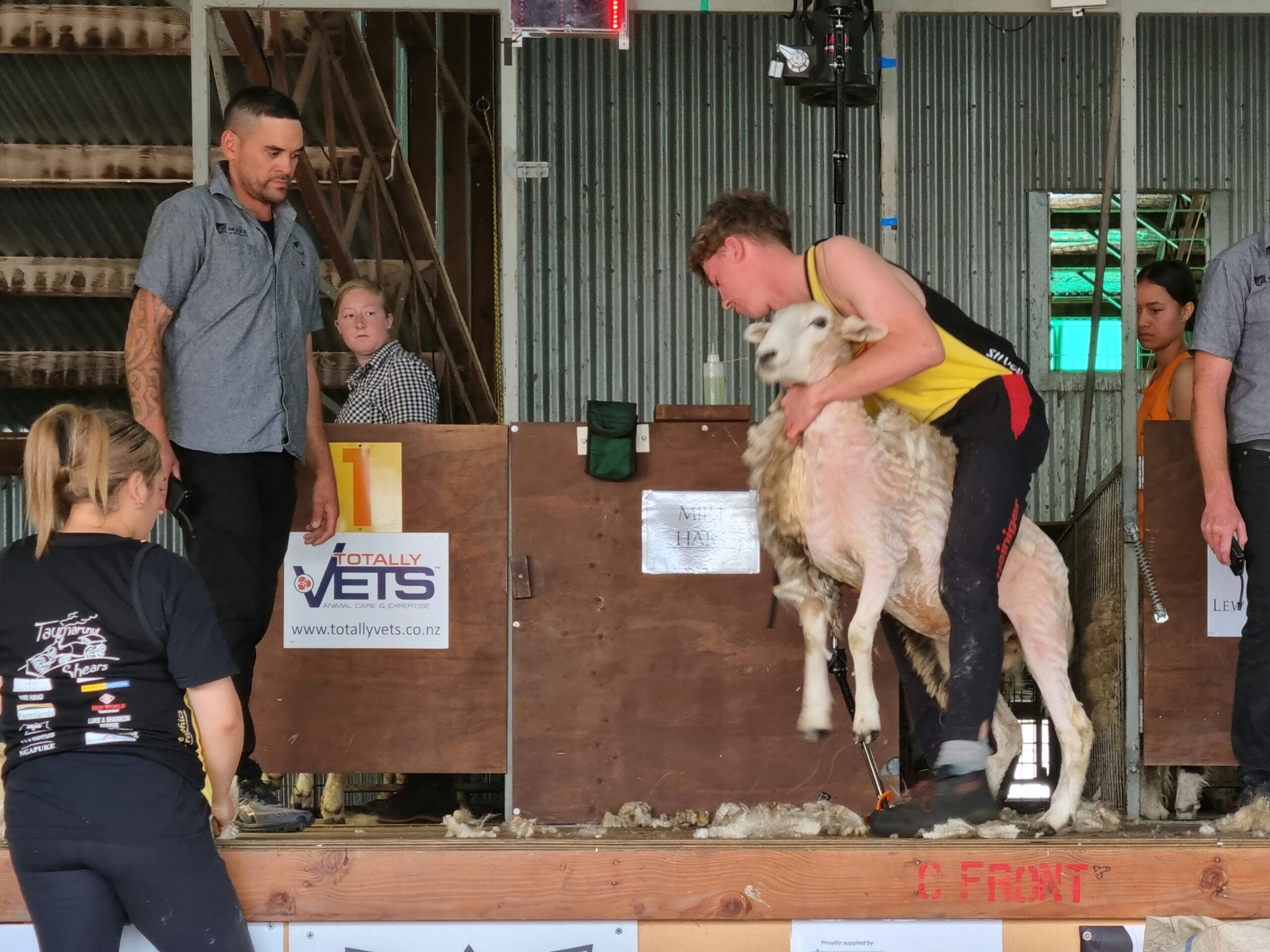 Bea hatte auf der Fahrt zum Tongariro gelesen, dass heute Freitag rund eine Autostunde vom Tongariro Nationalpark entfernt, mitten in der Landwirtschaftszone, ein Schafschurwettbewerb stattfand. Über das Touristenbüro erfuhr sie die genaue Adresse. So fuhren wir heute hin und genossen rund zwei Stunden lang Schafschur live.