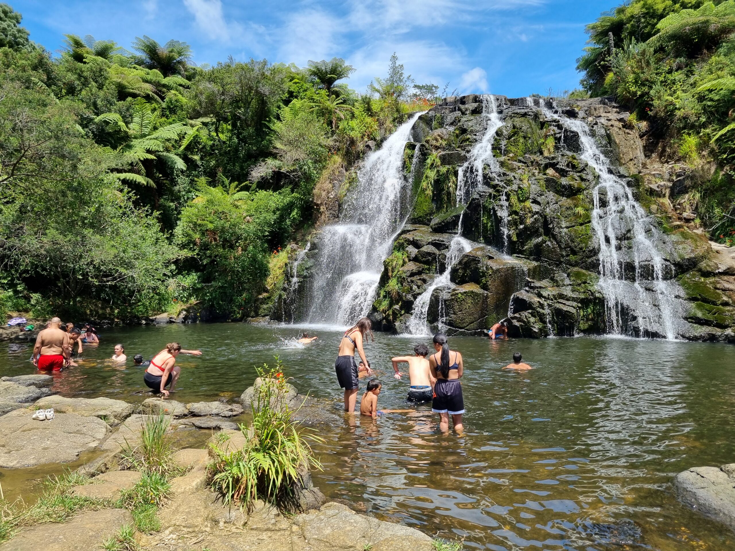 Auf unserer gestrigen, längeren Fahrt von Cooks Beach auf der Coromandel-Halbinsel nach Rotorua, der Stadt der Thermalbäder und Geysire, machten wir Halt bei einer anderen Art des Badevergnügens, den Owharoa Falls in der Nähe von Waihi. Ganze Familien verbrachten hier den Samstag im kühlen Schatten der Bäume oder vergnügten sich im Wasser – bei schwülwarmen 27 Grad eine gute Sache.