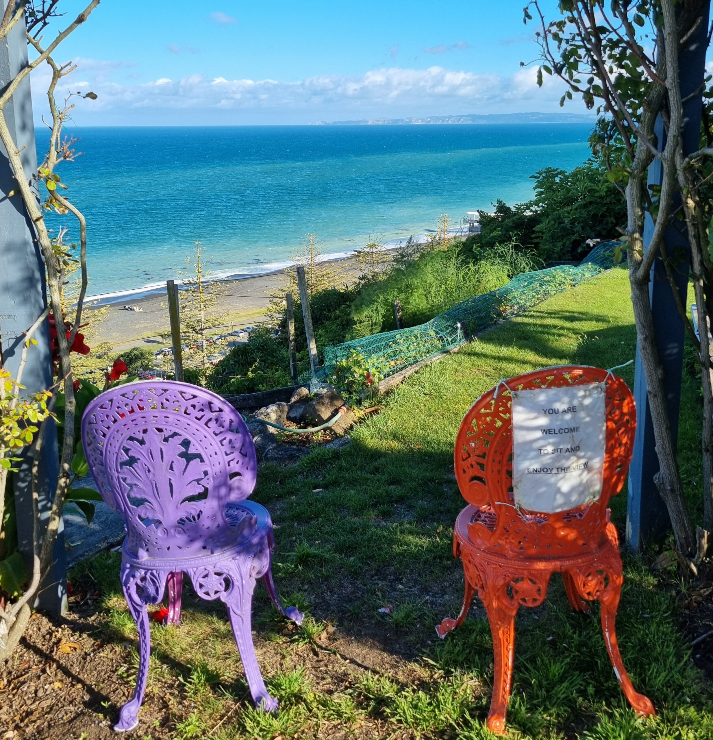 Die Gegend ist Neuseelands zweitgrösstes Weinanbaugebiet, kein Wunder, gehört sie doch zu den sonnigsten im Land. Zudem gilt die Hawke’s Bay als die Obstschale Neuseelands. Äpfel, Pfirsiche und Birnen wachsen hier in grossen Plantagen. Wie wohnen in Havelock North, in der Region mit den meisten Weingütern. Unser schönes Häuschen für die Zeit von Samstag bis Donnerstag befindet sich denn auch inmitten von Rebstöcken, welche sich in bequemen Gartenmöbeln geniessen lassen.